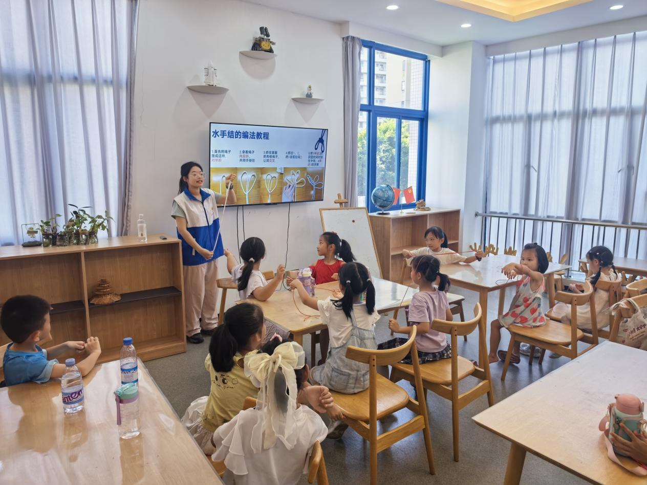 活动起初,航海学院志愿者向孩子介绍 “海丝结”,用 PPT 演示与风趣讲解,简述其由来、用途及绳结编制过程,还与小朋友互动提问,让孩子在轻松氛围中触摸海洋文化脉络。
