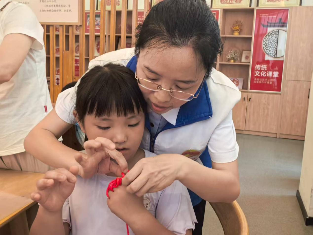 接着,志愿者解读绳结历史,以图文展示渔绳结在古代航海与渔业中的作用,再用实物教孩子认识 “瓶口结”“水手结”“团圆结”。动手环节,孩子兴奋持绳跟学打结;家长受感染加入,亲子协作编织。绳线变紧实绳结时,现场惊叹连连,众人专注创作、交流技巧,既提升动手能力,又增进亲子与邻里情。