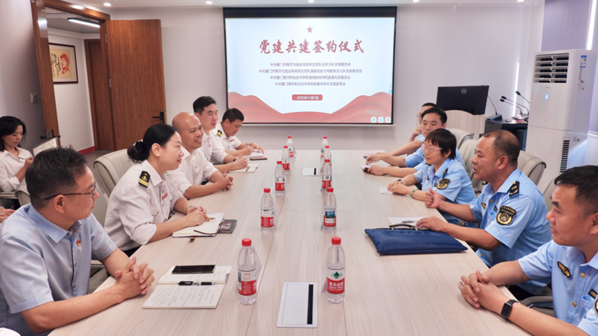 2025年11月7日,厦门市海洋与渔业综合执法支队业务大队党支部、厦门市海洋与渔业综合执法支队渔船检验与特勤执法大队党支部、厦门海洋职业技术学院继续教育学院直属党支部、厦门海洋职业技术学院航海学院党总支四方党建共建签约仪式于思明校区党建中心举行。厦门市海洋与渔业综合执法支队一级调研员郑斌,校党委书记陈一端,各党组织书记、副书记、支委及党员代表出席活动。
