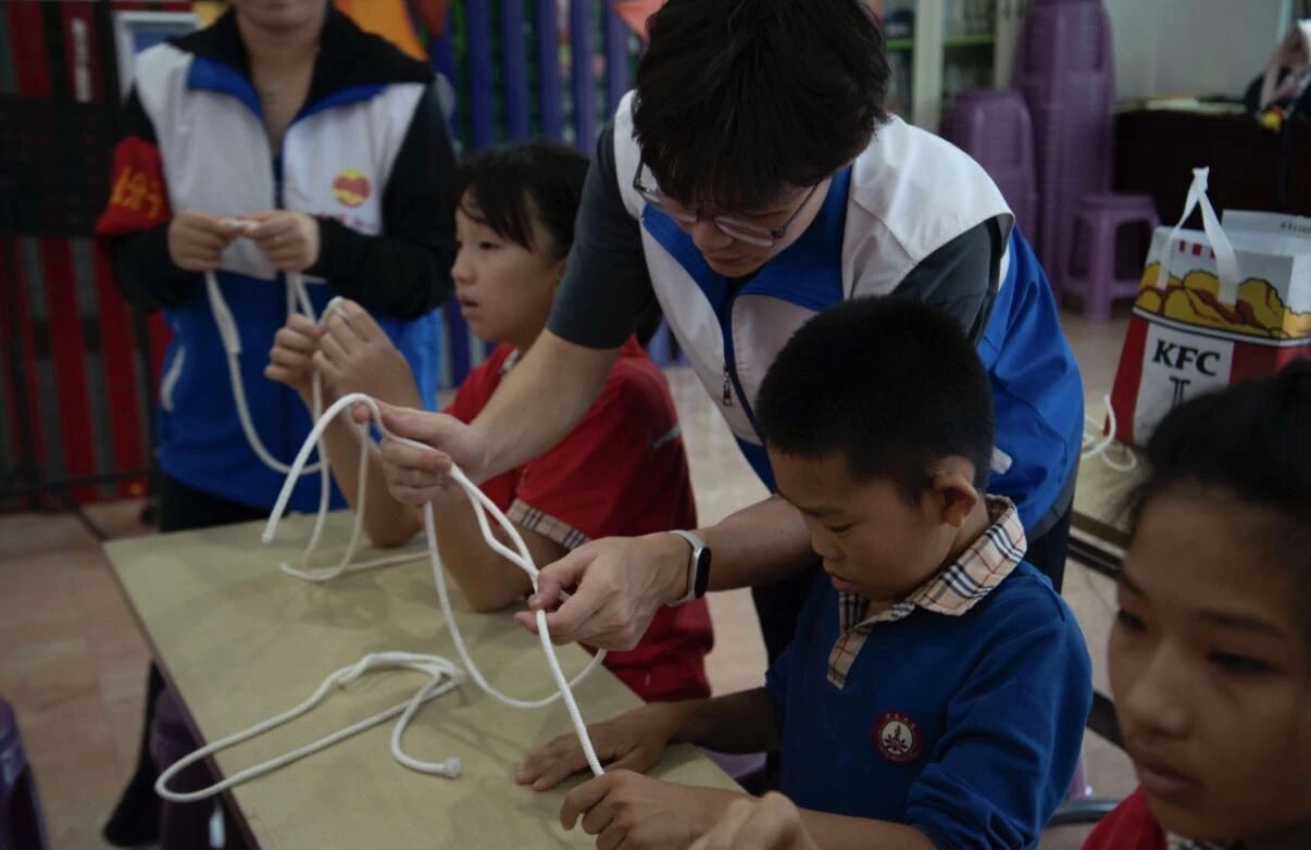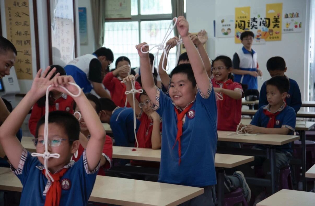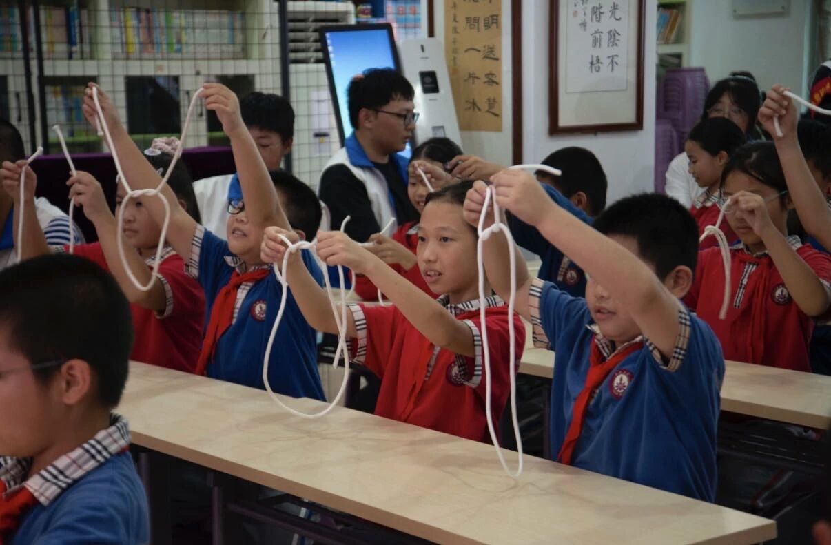 进入动手实践环节,孩子们兴奋地拿起绳子,紧紧跟着志愿者的步骤,一步步打结、调整绳线。当原本松散的绳线在指尖逐渐变幻,最终变成一个个结实的绳结时,教室里瞬间爆发出阵阵欢呼与赞叹,孩子们争相说道:“太好玩啦!太神奇了!我还想学其他的花样!”