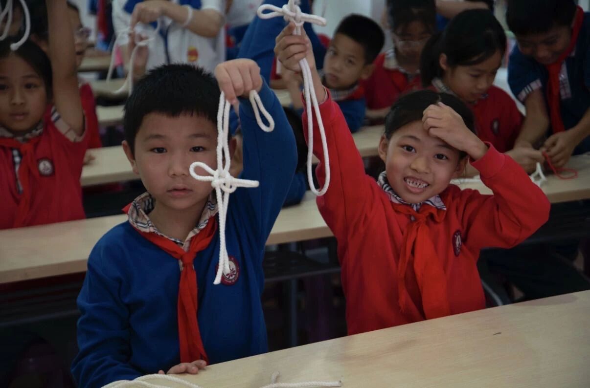 进入动手实践环节,孩子们兴奋地拿起绳子,紧紧跟着志愿者的步骤,一步步打结、调整绳线。当原本松散的绳线在指尖逐渐变幻,最终变成一个个结实的绳结时,教室里瞬间爆发出阵阵欢呼与赞叹,孩子们争相说道:“太好玩啦!太神奇了!我还想学其他的花样!”