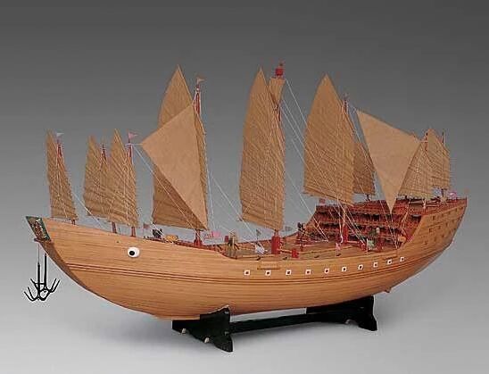 广船产于广东,唐宋时期是发展成熟期,定型于元明,以首低尾高,上宽下窄,瘦尖底等为形体特征,适合在广阔的南海和大洋中航行。