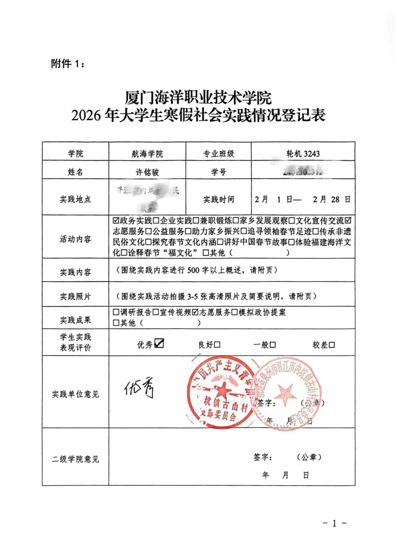 - 寒假返乡实践①|轮机3243许铭骏:青春暖冬行,志愿践初心