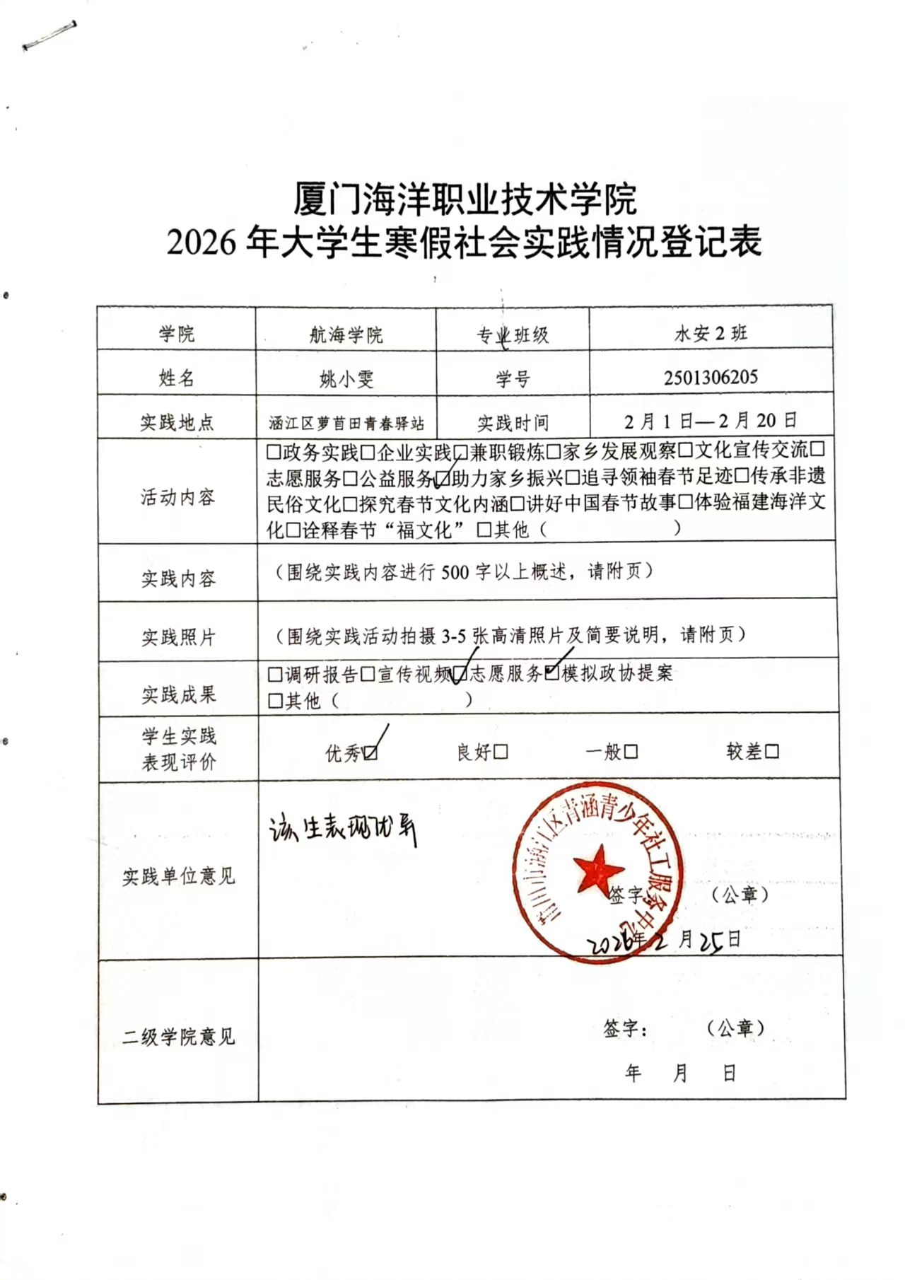 • 为践行新时代青年使命,航海学子寒假期间开展“返家乡”社会实践专项活动。同学们秉承“奉献、友爱、互助、进步”的志愿精神,分赴基层社区与社会各领域开展服务:或深入群众解难题,或立足岗位练本领,以实际行动彰显青春担当,在服务中淬炼品格,于实践中增长才干,谱写了一曲动人的青春乐章。快来看看他们都做了哪些暖心又有趣的事吧~