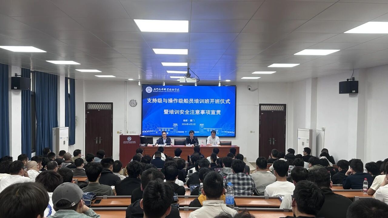 2026年4月3日,我院支持级与操作级船员2026年春季培训班开班仪式暨培训安全注意事项宣贯会顺利举行。安全处副处长汪正纲,学院副院长付乾坤、厦门航洋船舶服务有限公司总经理赵锦锋出席仪式,参训学员近150人参加活动。