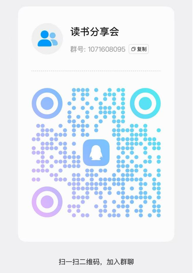 4.报名方式:扫描下方 QQ 二维码,加入读书分享会招募群(群内将同步报名流程,记得及时关注群消息哦~)