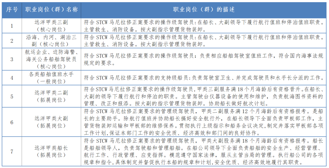 无限航区及沿海航区海船操作级船员,海上工程船和移动平台等驾驶岗位,航运相关企业的业务运营岗位或安全管理岗位。职业目标主要涉及三个核心岗位、一个一般岗位和三个拓展岗位见下表。