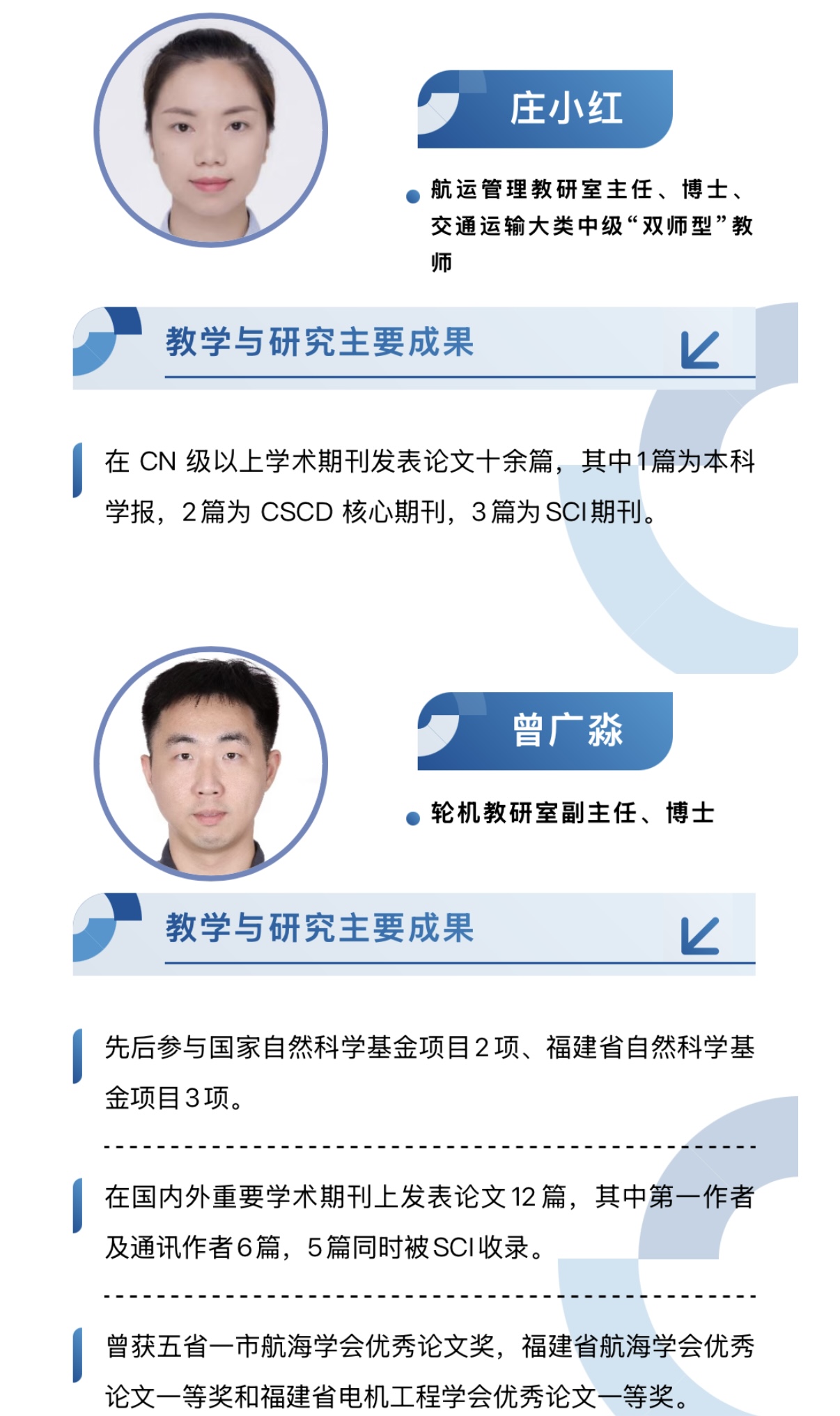 百年来,学院已为国家培养了3万多名中高级航海类专门人才,校友遍布五洲四海,献身于祖国的航运事业。近十年,学院在科学研究和教学改革方面取得了显著的成绩,获得国家艺术基金项目1项;教育部“高校思想政治工作质量提升综合改革与精品建设项目”1项;教育部港澳台国情重点项目1项;教育部“1+X”证书制度试点项目2项;全国职业院校技能大赛职业院校教学能力比赛三等奖1项;全国职业教育专业教学资源库子项目5项;福建省高等职业教育教学成果特等奖2项、二等奖1项,全国物流职业教育成果奖二等奖1项;全国港航物流与管理专业教师教学设计竞赛一等奖1项、三等奖1项;福建省职业院校信息化教学大赛一等奖 3 项、二等奖1项、三等奖4项;福建省“互联网+”大学生创新创业大赛金奖 2 项,银奖 7 项,铜奖 4 项;获得省级课程思政示范项目2项,省级课程思政示范团队2 个;建设省级教学资源库1个,省级精品在线开放课程6门,省级职业教育在线精品课程3门。省级以上教科研课题项目共计26项。共获得国际级奖项1项、国家级项目及奖项17项、省级项目及奖项38项;在国家级技能竞赛中,获特等奖1项,一等奖2项,二、三等奖11项,优秀组织奖1项;省级职业技能竞赛中,一等奖2项,二、三等奖18项。