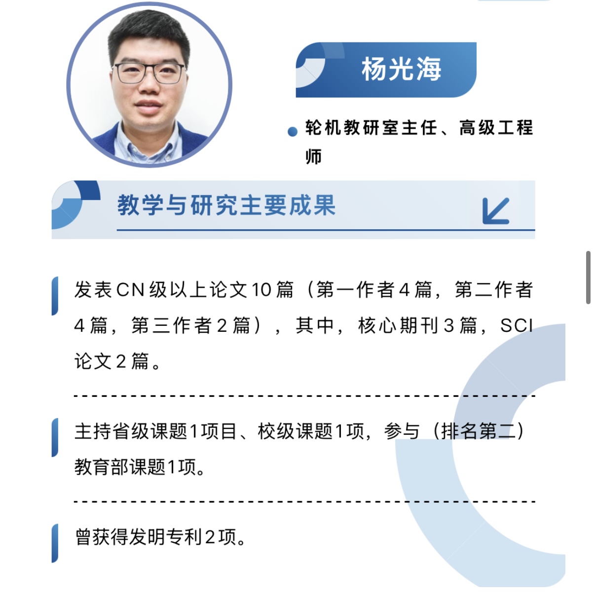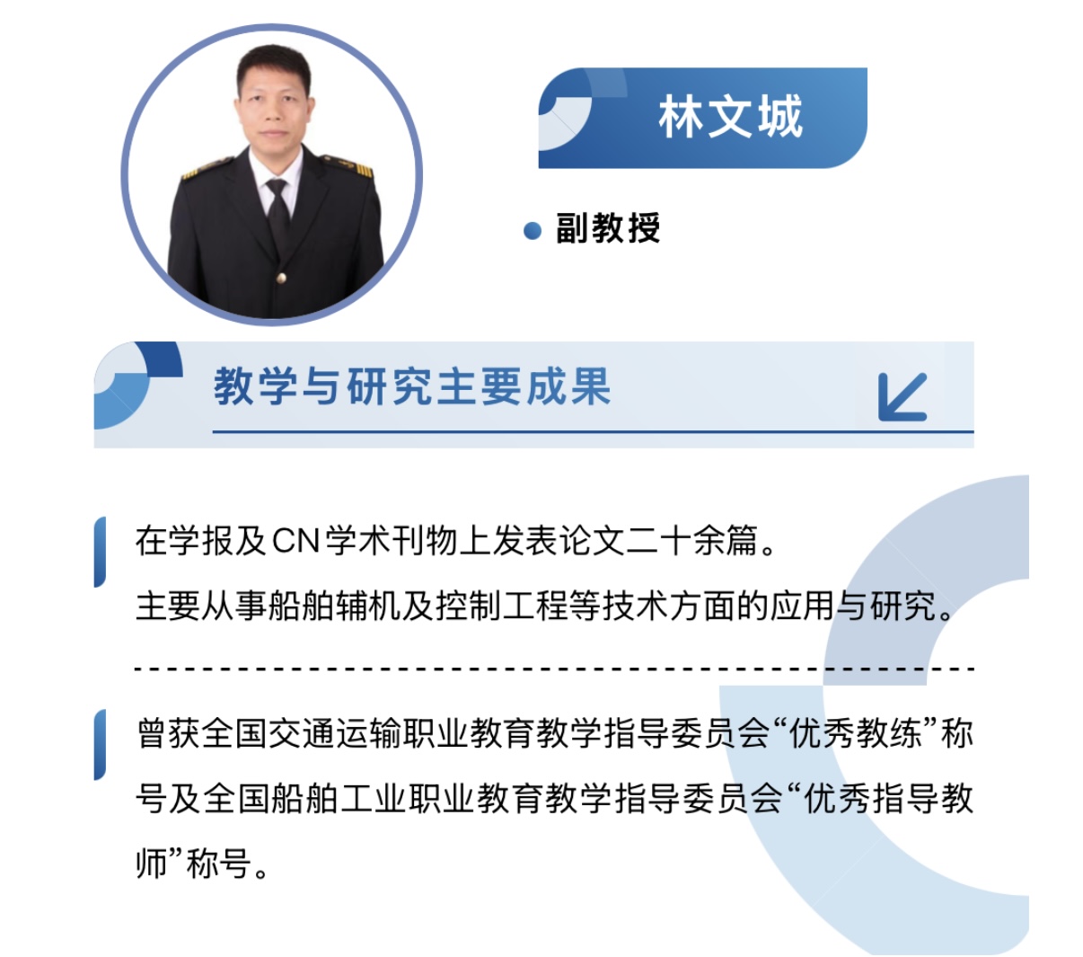 现有专兼职教师71人,其中正高职称4人,副高职称13人,博士9人,具有高级船长、高级轮机长等海船船员适任证书的教师33人。学院拥有一支结构合理、具有丰富理论和实践教学经验、具备敬业精神和熟悉掌握职业教育教学规律、能胜任轮机工程技术专业群及海洋交通运输专业群、高等职业教育发展需求的师资团队。