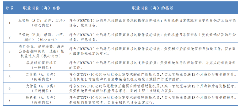 无限航区及沿海航区海船操作级船员,海上工程船和移动平台等驾驶岗位,航运相关企业的业务运营岗位或安全管理岗位。职业目标主要涉及三个核心岗位、一个一般岗位和三个拓展岗位见下表。