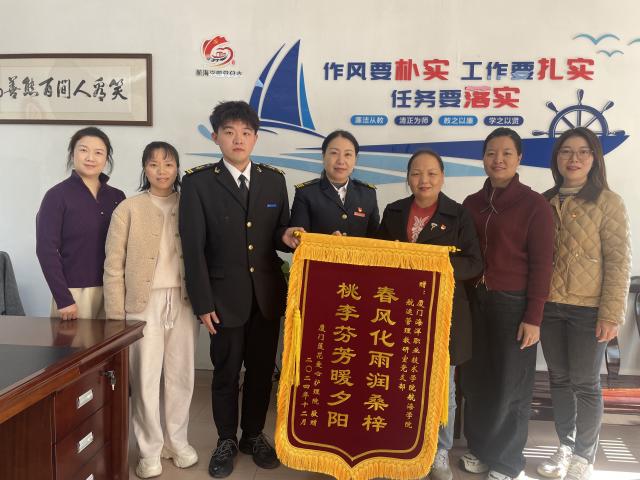 1月6日上午,厦门莲花爱心护理院黄院长携社工吴燕燕来访,为航运管理教研室党支部送来锦旗“春风化雨润桑梓 桃李芬芳暖夕阳”。航海学院党总支书记、院长林珊仟携党支部书记庄小红和支委们,热情接待了黄院长和吴社工,相互分享十余年来志愿活动的点滴,交流志愿服务的活动经验,探讨未来的合作规划。