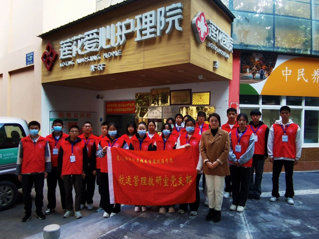 近日,航运管理教研室党支部与莲花爱心护理院开展党建共建活动,支部党员教师带领航海学院“山茶花”敬老志愿服务队的24名青年志愿者到莲花爱心护理院为老人们献爱心、送温暖
