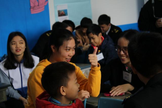 第二节课,由航海系义教小老师带来“中泰日常用语教学”,从祝福语入手,让中泰小朋友们互相问候。他们一起学中文,一起学泰语,互当小老师,课堂上充满了欢声笑语,汇成一片欢乐的海洋。
