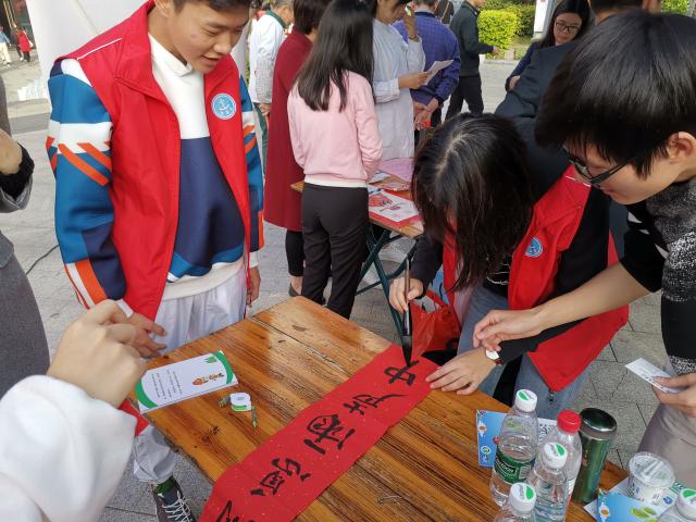 在活动现场,志愿者们有条不紊地铺开羊毛毡,摊开红宣纸,摆齐墨水笔砚,和社区的老人、小孩们将准备好的喜庆诗词誊到纸上。书香袅袅之中,传统文化的气息氤氲围绕,起承转合、一笔一划之间尽显书法魅力。现场书写完毕后,我们将春联赠送给当地居民。社区的民众纷纷驻足围观,有序排队,领取对联。此次的传统文化进社区活动很受老人们的欢迎,他们频频点头称赞我院学子的能力与素质。