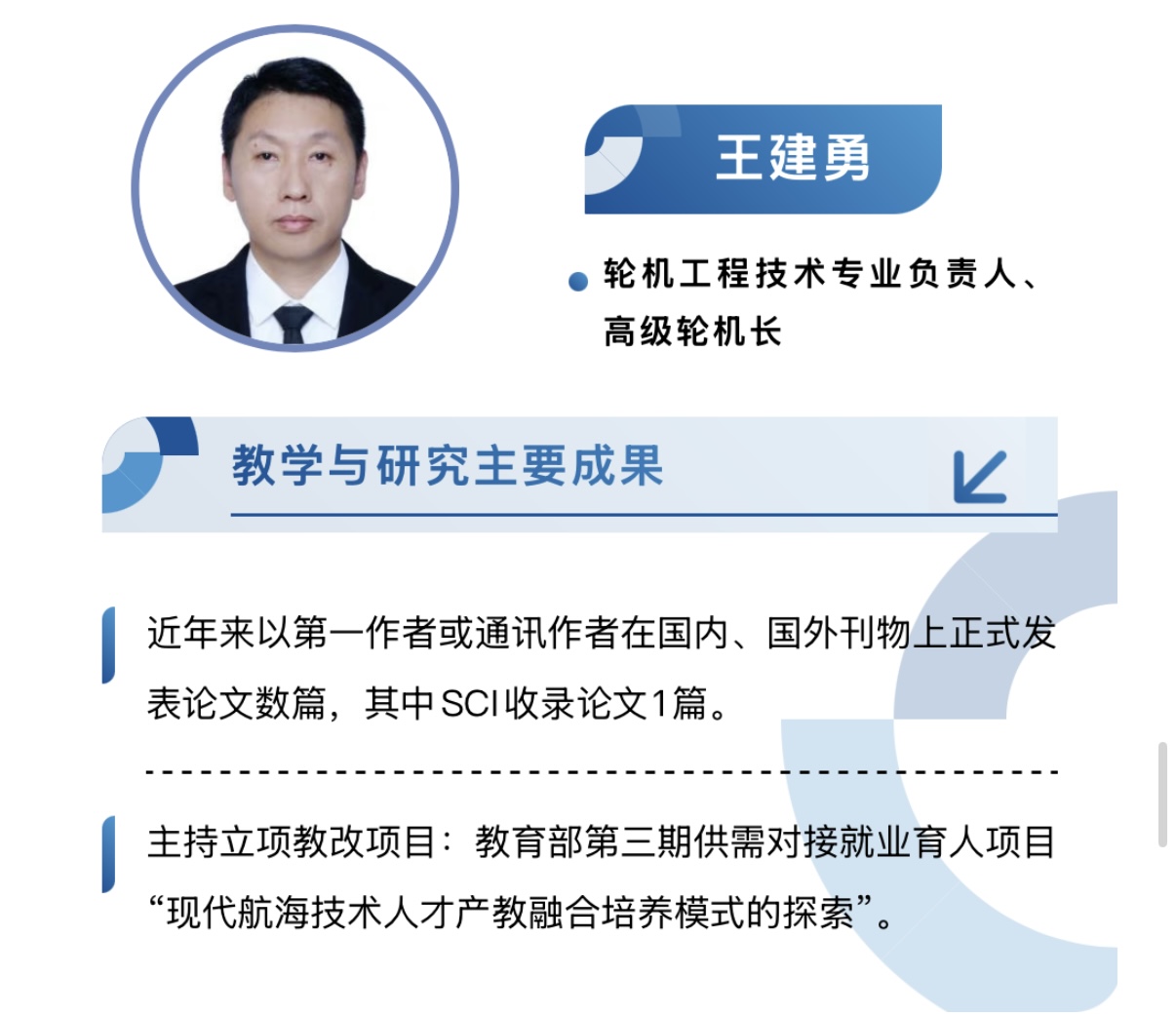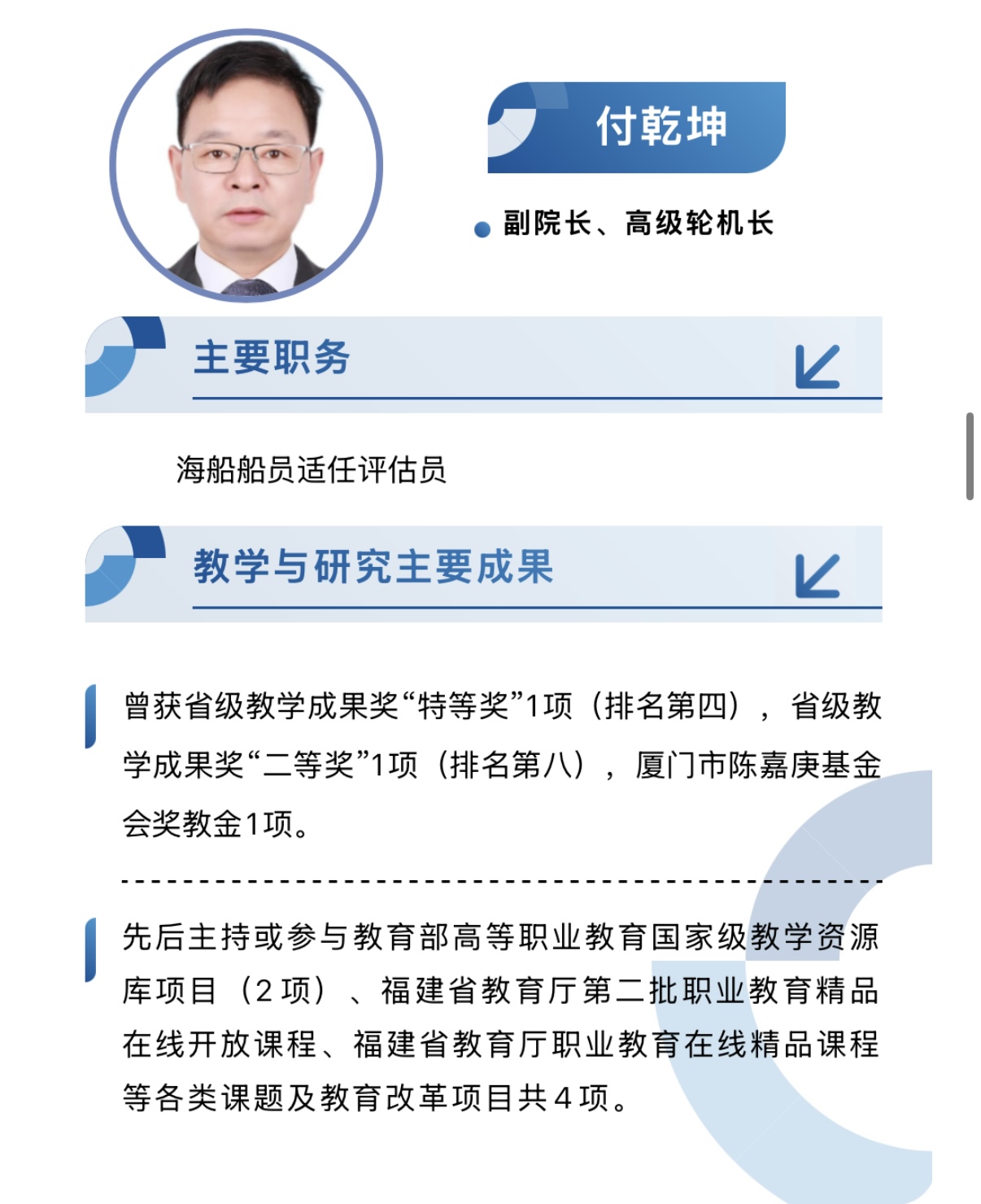 现有专兼职教师71人,其中正高职称4人,副高职称13人,博士9人,具有高级船长、高级轮机长等海船船员适任证书的教师33人。学院拥有一支结构合理、具有丰富理论和实践教学经验、具备敬业精神和熟悉掌握职业教育教学规律、能胜任轮机工程技术专业群及海洋交通运输专业群、高等职业教育发展需求的师资团队。