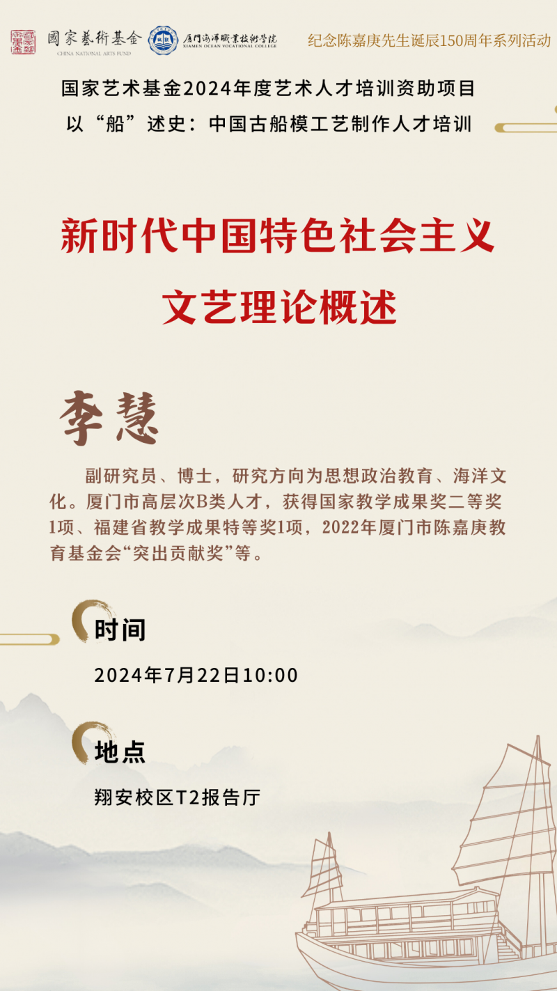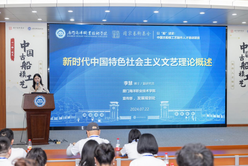 2024年7月22日上午开班仪式后,国家艺术基金“以‘船’述史:中国古船模工艺制作人才培训”项目在我校翔安校区T2报告厅开展开班第一课。李慧讲授《新时代中国特色社会主义文艺理论概述》,带领学员们深入学习习近平总书记关于新时代文艺工作重要论述,加深对文艺工作的认识与了解。