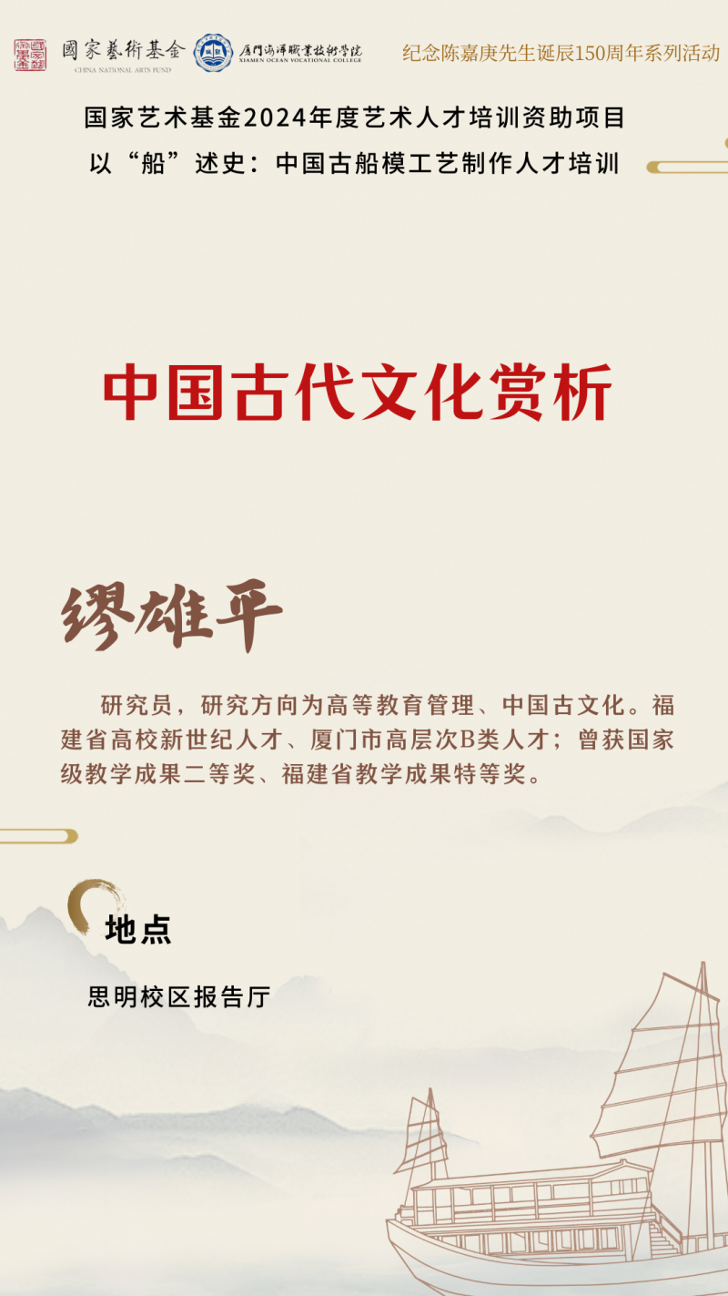 近日,缪雄平为国家艺术基金“以‘船’述史:中国古船模工艺制作人才培训”项目学员讲授《中国古代文化赏析》。课程主要分为三大部分:中国古诗、赋、楹联赏析,四大名著赏析及中国优秀传统文化的启示。