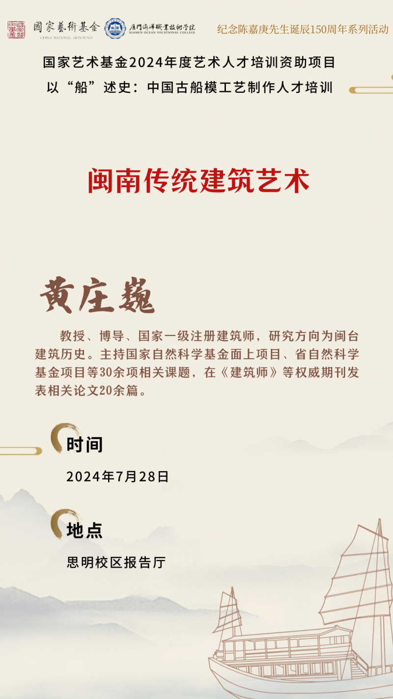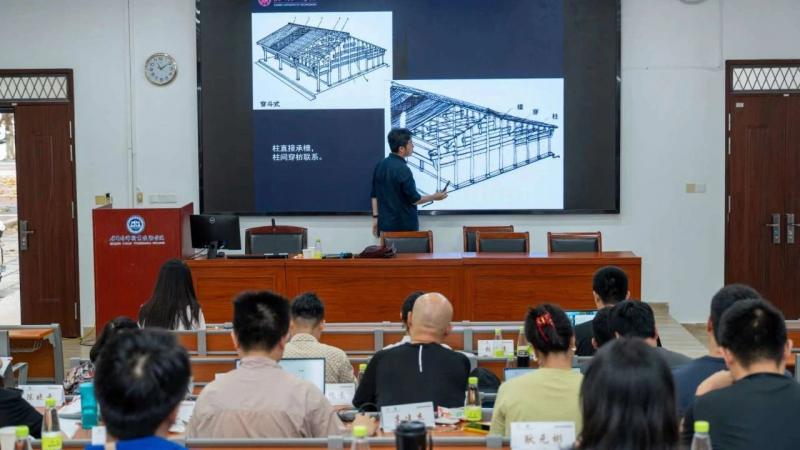 2024年7月28日,黄庄巍为国家艺术基金“以‘船’述史:中国古船模工艺制作人才培训”项目学员讲授《闽南传统建筑艺术》。他从闽南传统建筑的布局、大木作、砖作、石作、屋顶及装饰五个方面进行了系统阐述,全面而深入地剖析了闽南建筑的艺术魅力与文化内涵,为后续船模制作奠定了建筑美学基础。