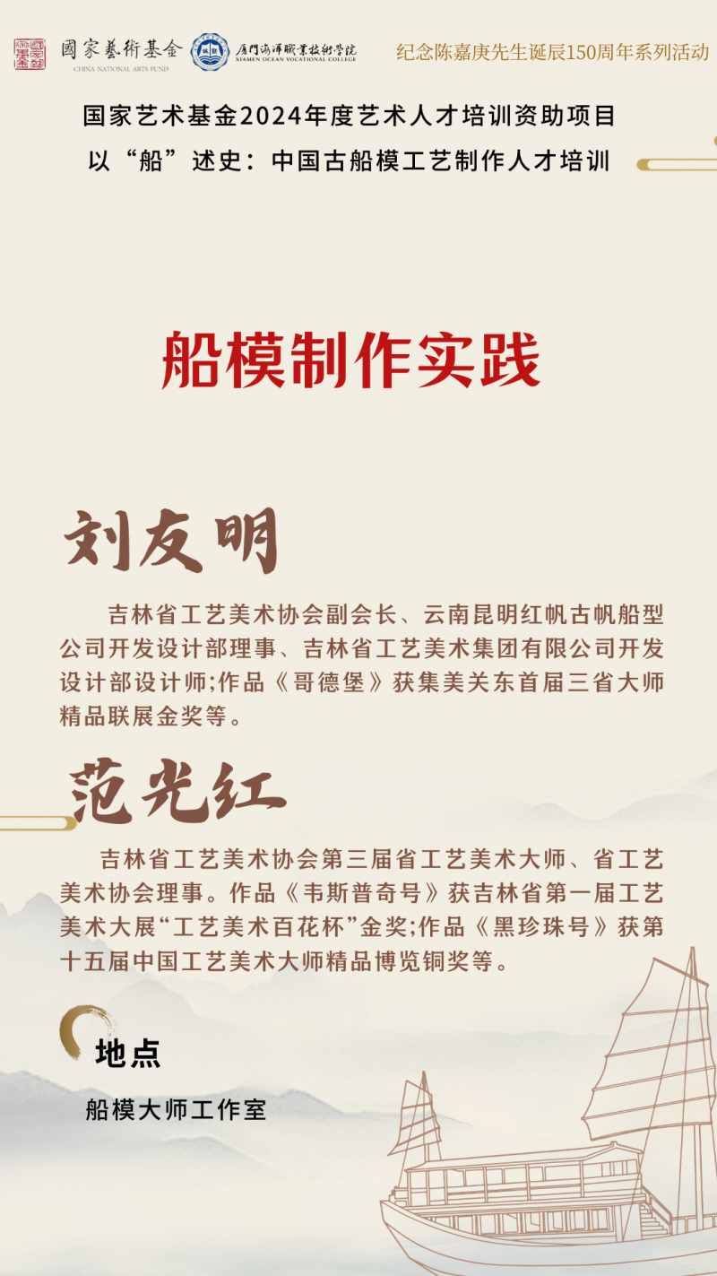 近日,刘友明、范光红为国家艺术基金“以‘船’述史:中国古船模工艺制作人才培训”项目学员讲授《船模制作实践》,并指导学员在西洋风帆战舰模型上安装绳梯、横帆和纵帆。