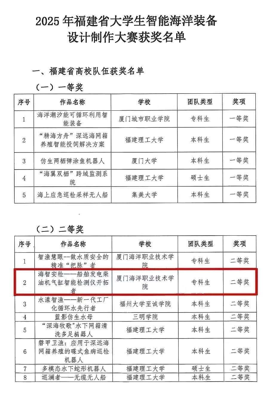 近日,2025年福建省大学生智能海洋装备设计制作大赛圆满落幕。我校航海学院“海智安检”团队在指导老师的悉心指导下,由吴怀玉、杨曼晞、王璇、陈瑞雅、王洁同学组成的核心团队,凭借项目“船舶发电柴油机气缸智能检测仪开拓者”,从众多参赛队伍中脱颖而出,成功斩获二等奖!这一荣誉不仅是团队日夜钻研的硕果,更是学院在智能海洋装备领域人才培养与科研创新的有力彰显。