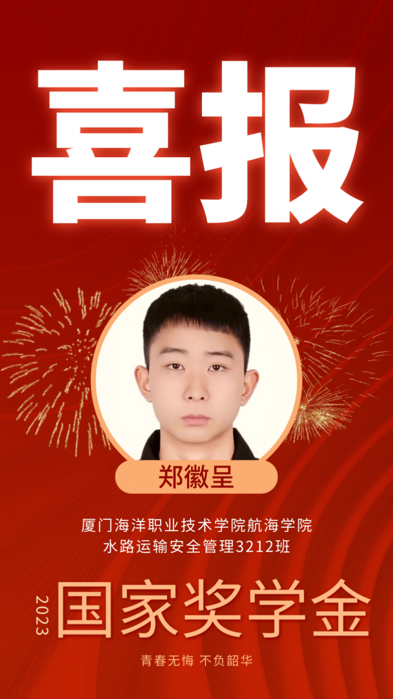 郑徽呈,中共预备党员,厦门海洋职业技术学院航海学院水路运输安全管理2021级学生,担任水安3212班班长。获2023年国家奖学金,2022年获得福建省“互联网+”大学生创新创业大赛职教赛道—金奖,连续两年荣获厦门市“陈嘉庚教育基金会奖学金”。