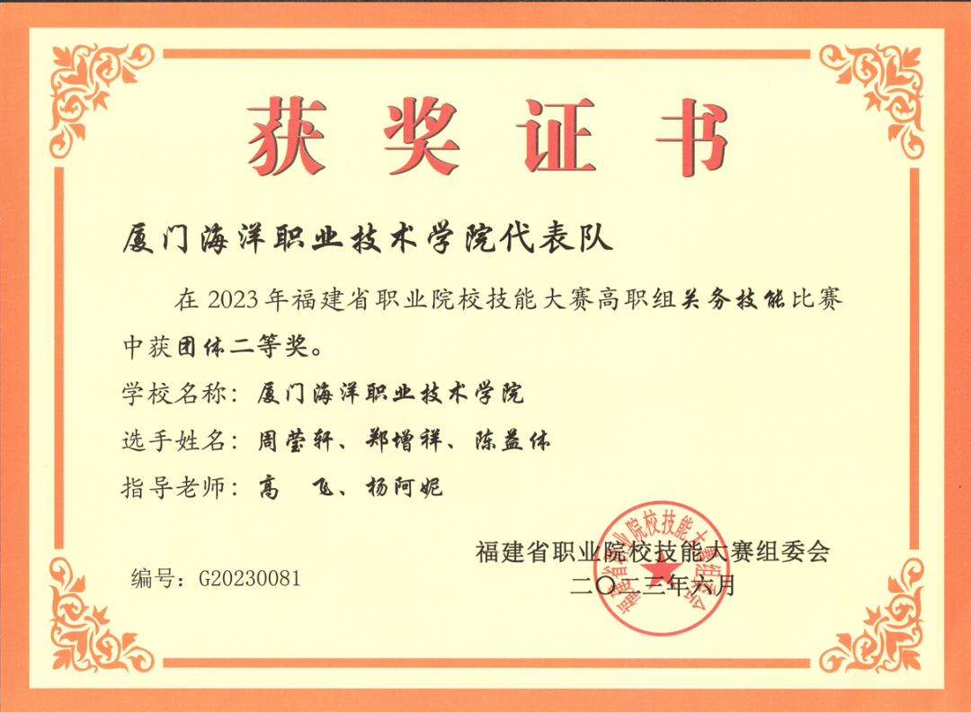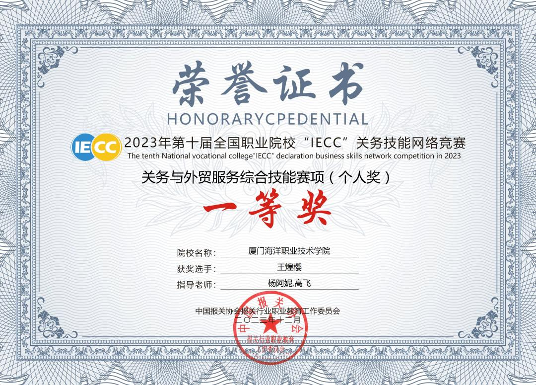 2020-2023年,厦门市职业院校技能大赛关务技能赛项,连续四年,多次获二等奖、三等奖。