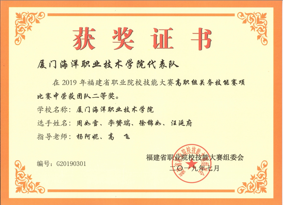 2019年,全国职业院校技能大赛关务技能赛项,获二等奖。