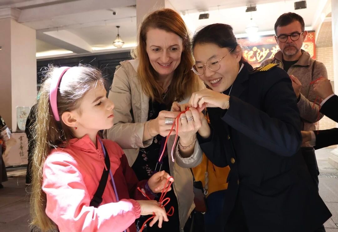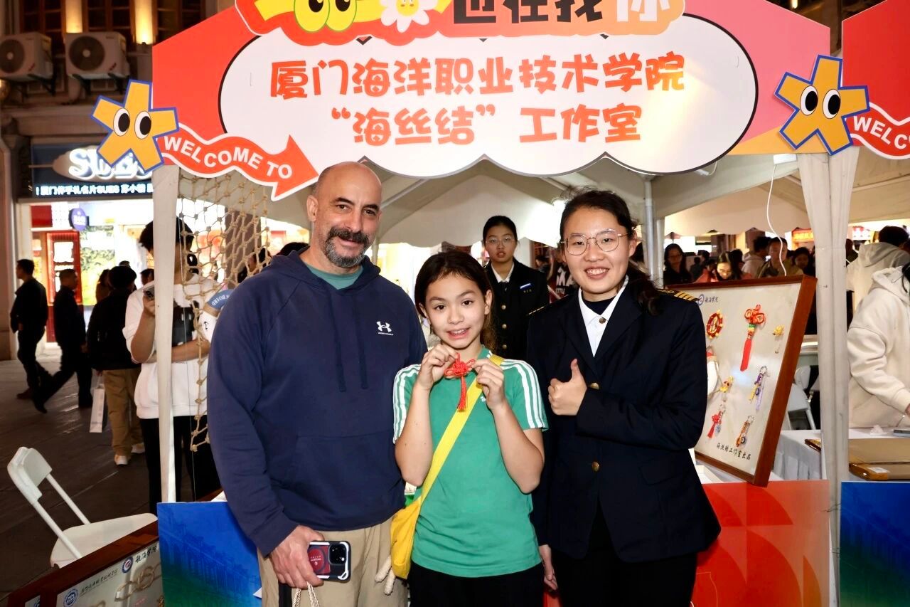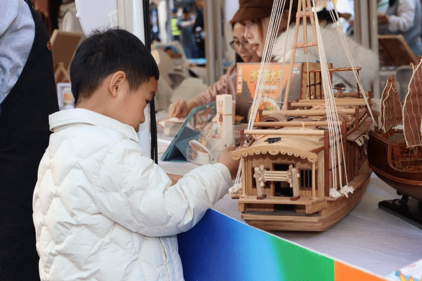 活动现场,我院船模大师工作室与“海丝结”工作室携手布展,呈现了精美的非遗船模与创意绳结文创作品。木质船模承载着海洋记忆,手工绳结编织着海上丝路的故事,在繁华街区中生动展现传统工艺的当代魅力。展位前游人络绎不绝,或驻足细赏,或交流询问,在赞叹工匠精神的同时,也深切感受到传统技艺与现代生活融合的活力。