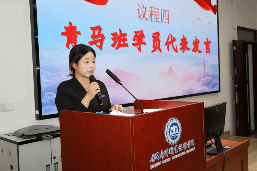 第三期青马学员代表包佳钰上台表态发言,表达了新学员们对学习的渴望和对未来的信心。