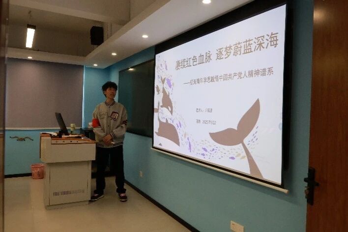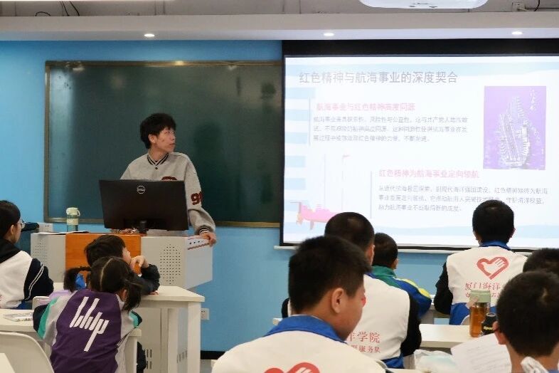 在“内核解读”环节,宣讲的同学结合福建舰的照片进行讲述:“从近代航海救国到现代海洋强国,正是共产党人精神谱系中的坚守初心、勇担使命,为航海事业定向领航,才有了这些国之重器守护万里海疆。”红色精神如何为航行赋能,航海人如何以攻坚克难的勇气面对风浪,一个个具体的故事,让孩子们读懂了精神谱系的实践力量。