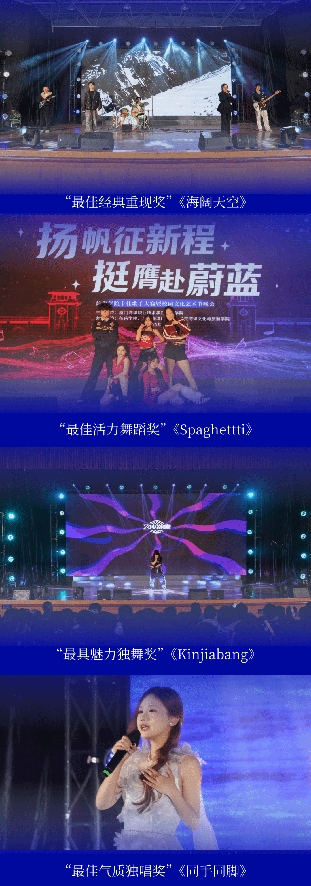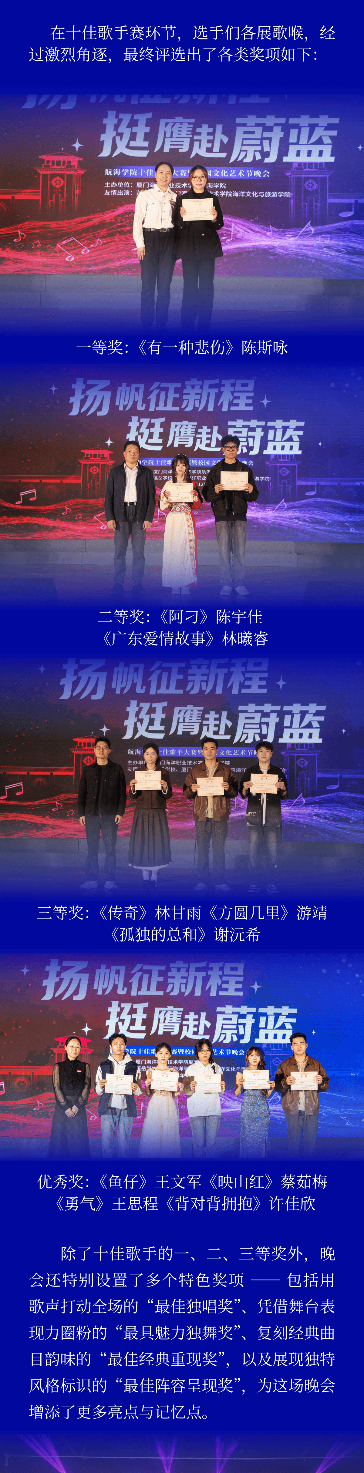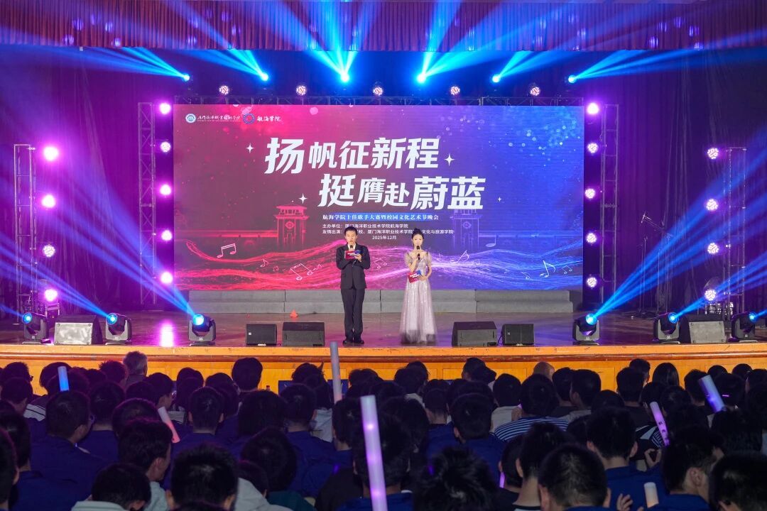 以歌为帆,以舞为浆。12月10日晚,“扬帆启新程,挺膺赴蔚蓝”2025航海学院十佳歌手赛暨迎新晚会在思想校区大礼堂隆重举行。本次晚会由航海学院主办,航海学院艺术团承办,并联合莲岳学校、海洋文化与旅游学院团总支、武术协会等多位师生同台献艺。莲岳学校校长毛继军一行,我校继续教育学院院长林金华、信息工程学院党总支书记林晓鹏等领导嘉宾莅临现场指导。航海学院师生代表800余人共同观看了演出。晚会由轮机3252班郑君豪、关务3254班汪子璇主持。