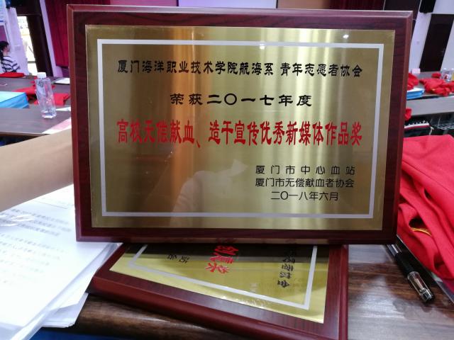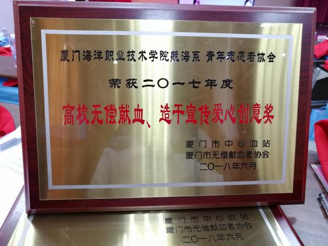 2018年6月3日,厦门市高校无偿献血宣传骨干培训班会议在厦门城市职业学院举行,会上对2017年度在无偿献血、造干宣传方面取得突出成绩的组织进行了表彰。航海系青年志愿者协会因在2017年无偿献血活动的组织和宣传中表现优异,荣获厦门市中心血站、厦门无偿献血者协会颁发的2017年度高校无偿献血、造干宣传爱心创意奖和2017年度高校无偿献血、造干宣传优秀新媒体奖。此外,在无偿献血活动的组织和参与过程中表现积极的黄艺山、蓝剑伟、陈彬彬、叶诗卉等同学荣获高校无偿献血志愿者荣誉称号。