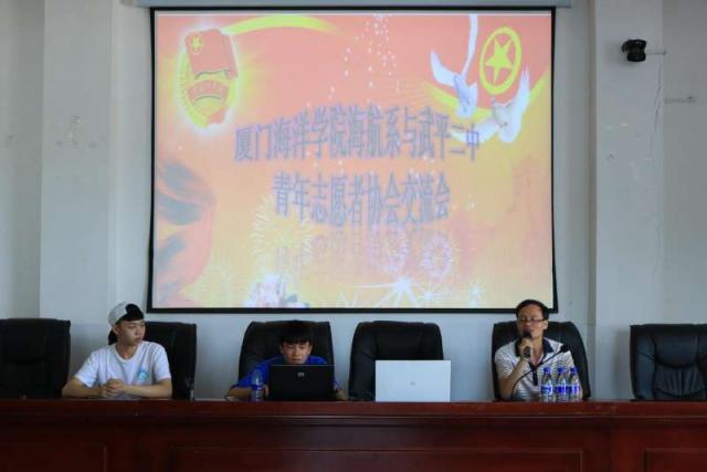 实践队首先来到武平二中举办“志愿经验交流会”,武平二中校长林伍连,副校长陈灿宗,团总支书记曾沈阳老师出席活动。会上,闽海传音队员重点介绍航海系志愿者活动的组织方法、宣传经验,以及如何利用微信、微博等社交媒体,“线上线下”进行志愿者招募、培训、推广、宣传等工作。随后,双方就此进行深入交流,互相学习探讨志愿服务活动的方式方法。对方表示,武平二中每年有不少学生考取厦门海洋职业技术学院,本次闽海传音队伍的到来,让武平二中的师生对我院有了更深入的了解,也带来更多合作的可能。