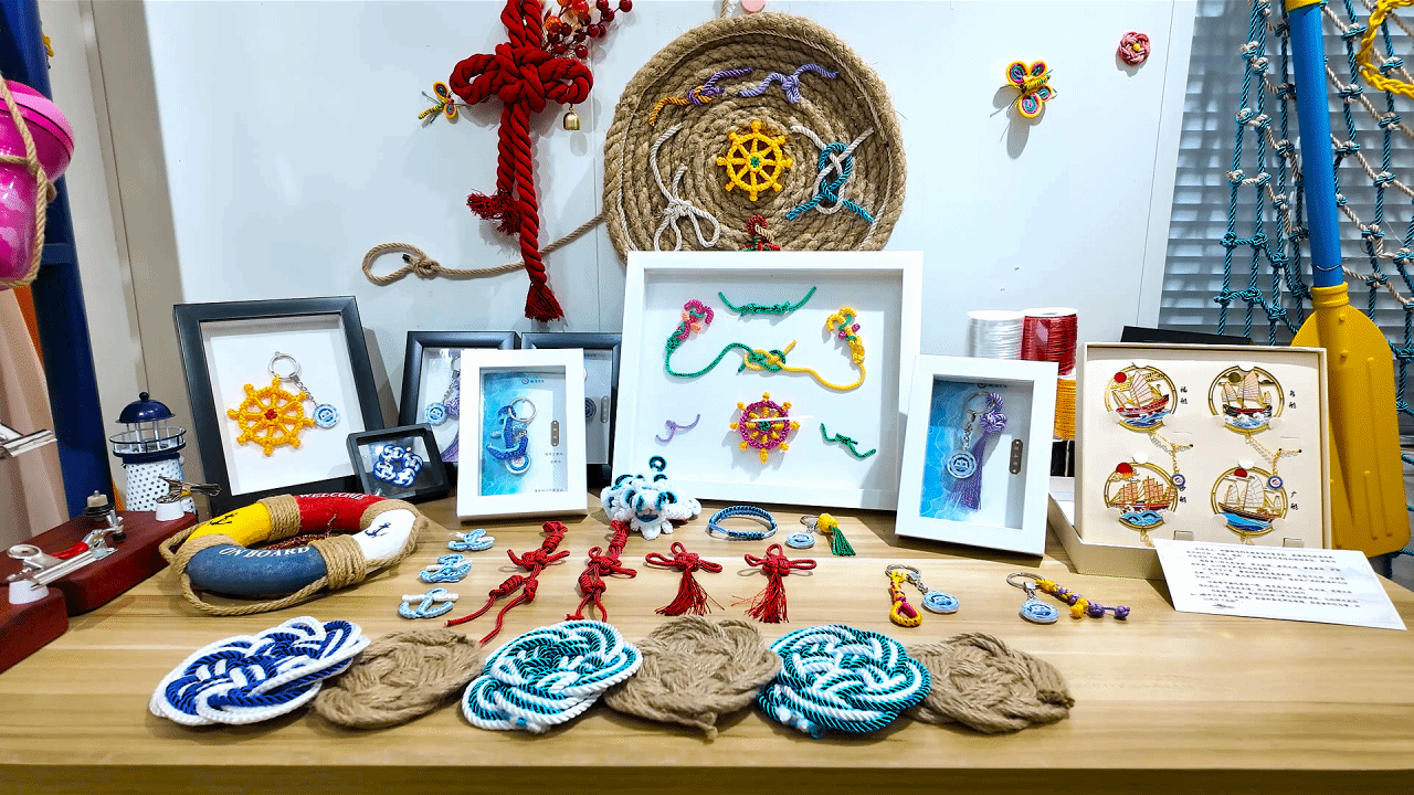实践队将探索视野从船舶延伸至与之密切相关的航海绳结技艺。团队成员曾寻访浙江两位“渔绳结”非遗传承人,系统学习并记录了多种传统渔绳结的打法与应用场景。在已有基础上,队员们充分发挥创意设计能力,开发出系列海洋主题文创产品。将航海常用的丁香结、平结、五星防撞结等,创新设计成船锚、船舵造型的钥匙扣、杯垫等实用物品。这些文创作品先后参与了青岛中欧非遗交流展示活动,成为传播海洋文化的有效载体。