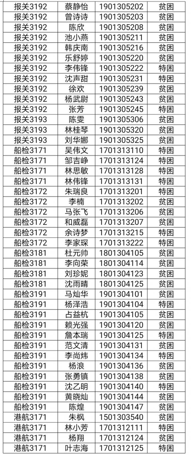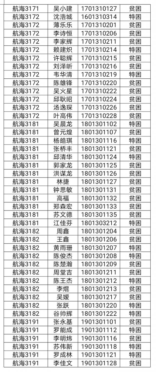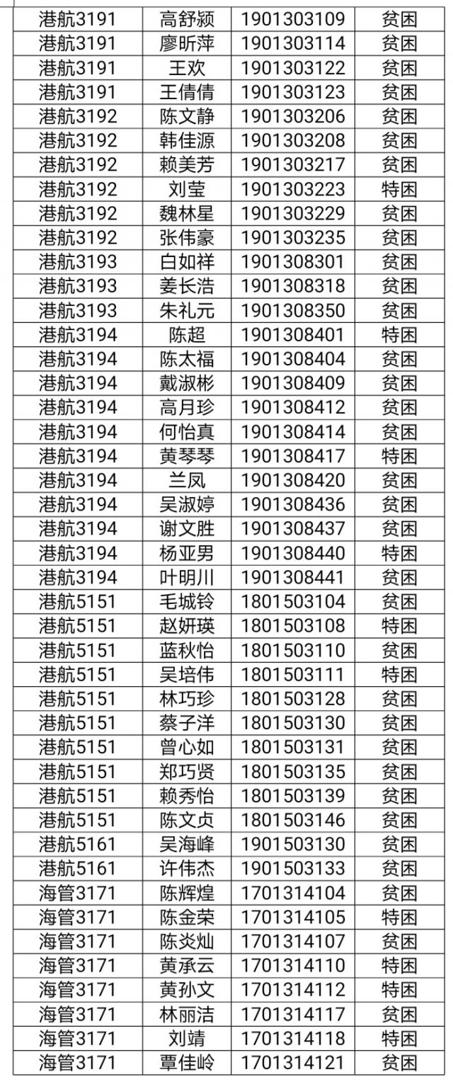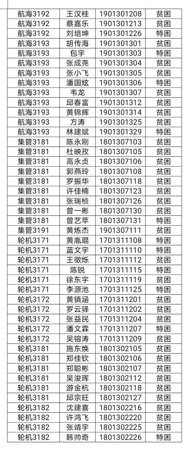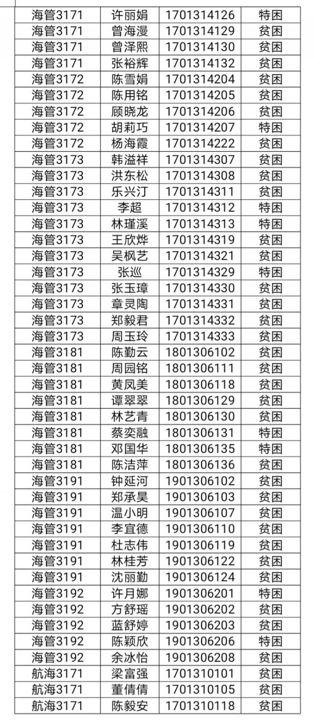根据《厦门海洋职业技术学院国家奖学金、国家励志奖学金及国家助学金评定管理办法》的规定,以及《关于做好2019-2020学年家庭经济困难学生认定工作的通知》《关于开展201920学年国家助学金申请及审核报送的通知》的要求,对我系2019-2020学年国家助学金名单公示,如下: