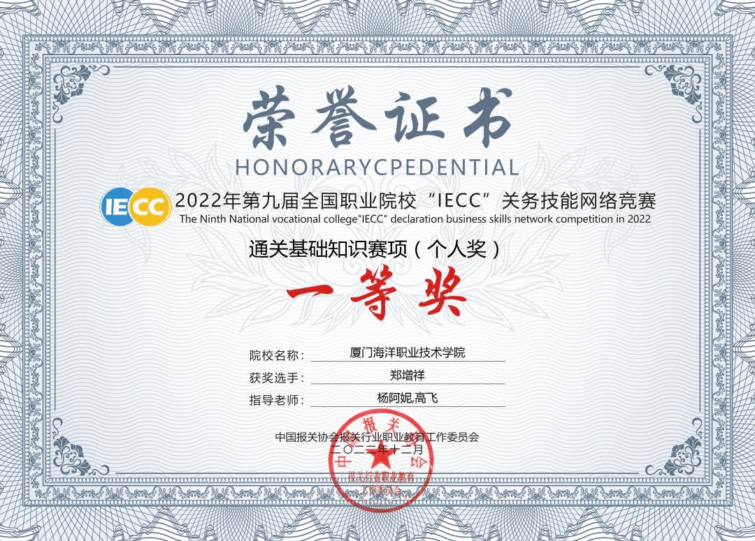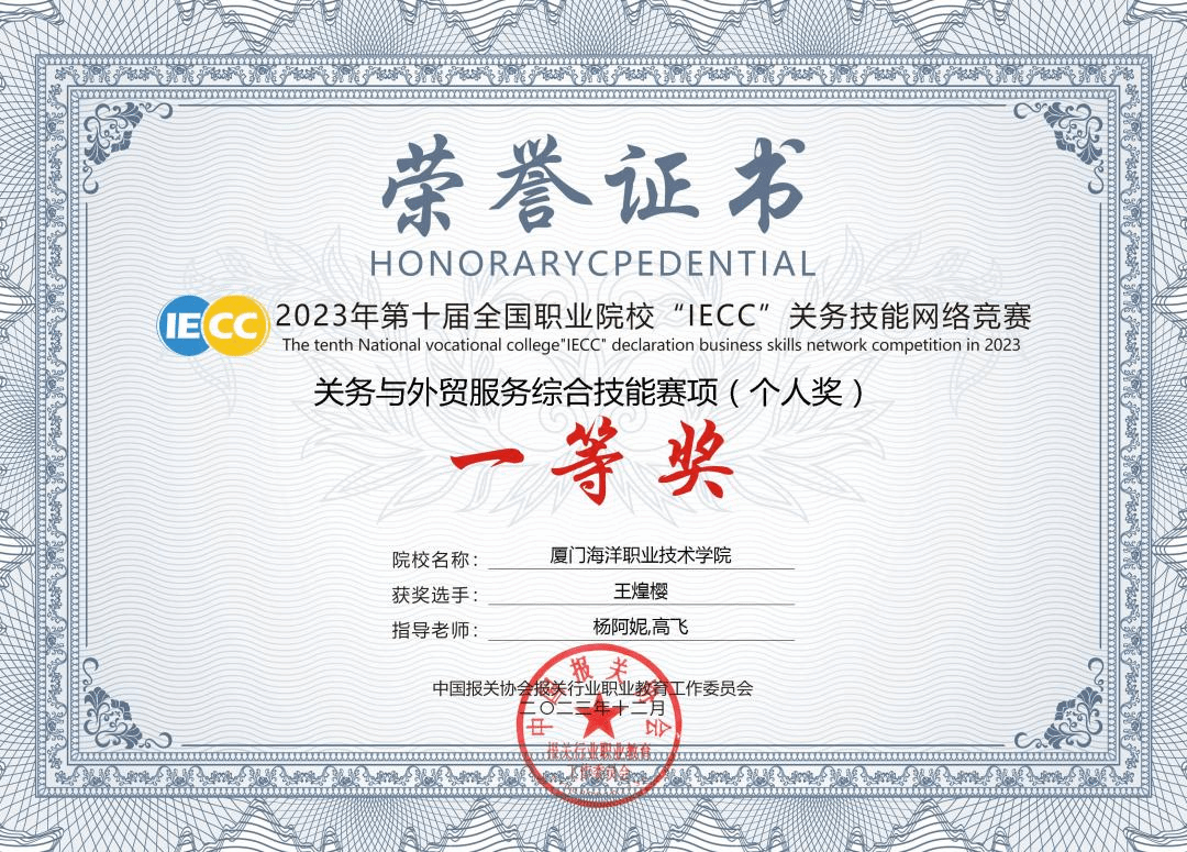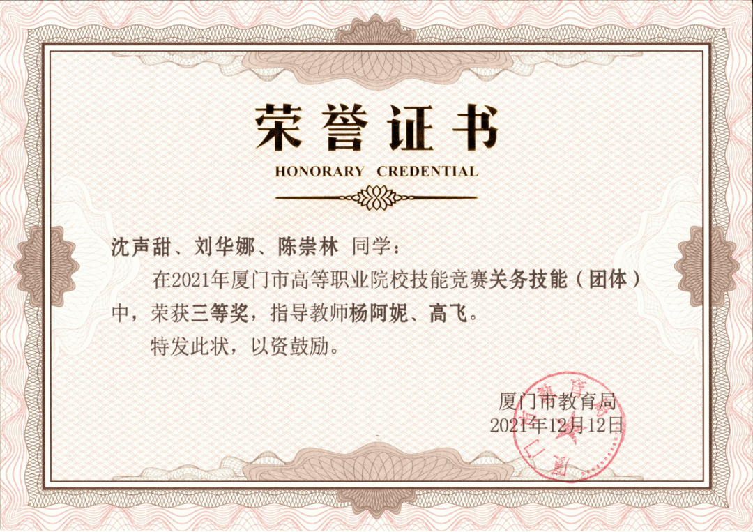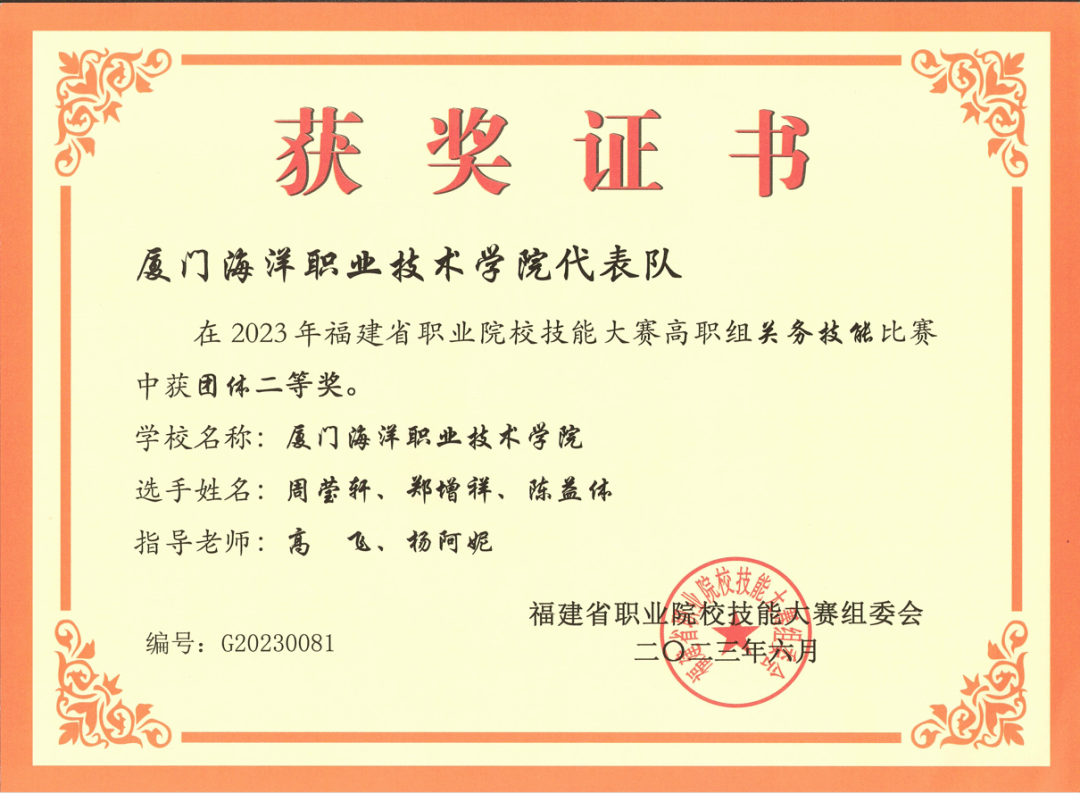 2020-2023年,厦门市职业院校技能大赛关务技能赛项,连续四年,多次获二等奖、三等奖。