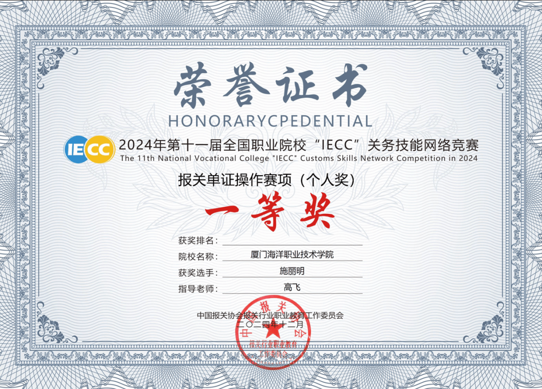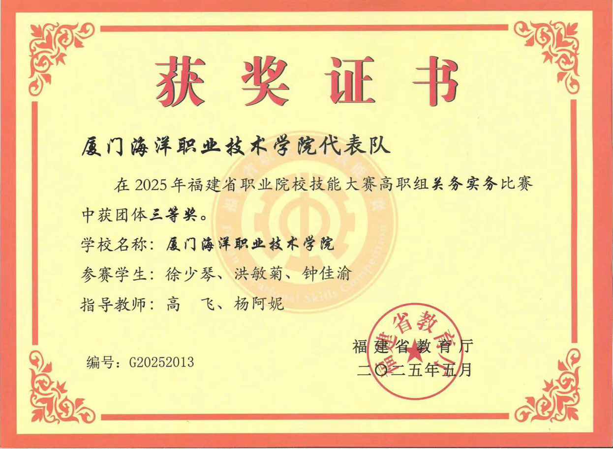 2025年,福建省职业院校技能大赛关务技能赛项,获一等奖和三等奖;
