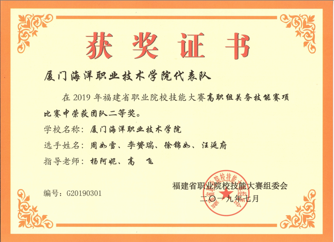 2019年,全国职业院校技能大赛关务技能赛项,获二等奖。