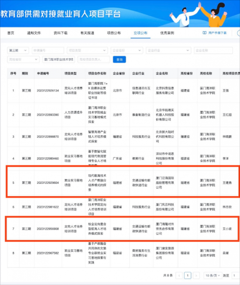 近日,教育部高校学生司印发《关于公布教育部第三期供需对接就业育人项目立项名单的通知》(教就业司函〔202423号),公布了第三期供需对接就业育人项目立项名单。航海学院与厦门泛海国际船舶管理有限公司合作的现代航海技术人才产教融合培养模式的探索就业实习基地项目、与厦门海隆对外劳务合作有限公司合作的校企定向复合型航海人才培养模式探索定向人才培养培训项目获批立项。